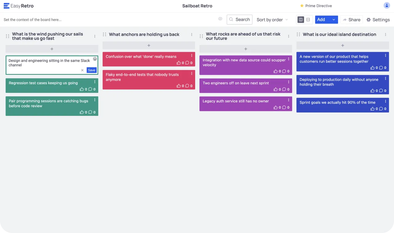 - Start with a retro. Pick a template you’d normally run in EasyRetro — a Sailboat or 4Ls — and see the difference a visual canvas with facilitator-controlled Activity Frames makes.