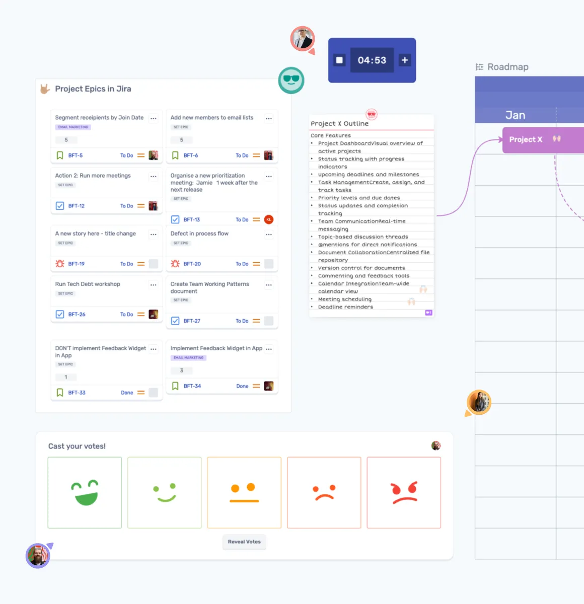 Retrospectives, sprint planning, estimation, story mapping, and other agile meetings can all be run in the same workspace.