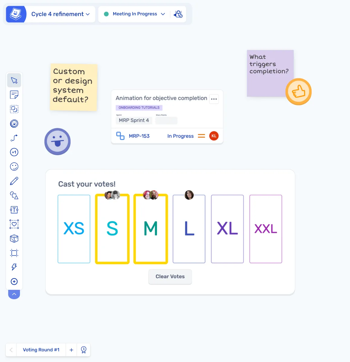 The team pulls Jira stories onto the board or uses a dedicated estimation template, so everyone can see the stories being estimated.
