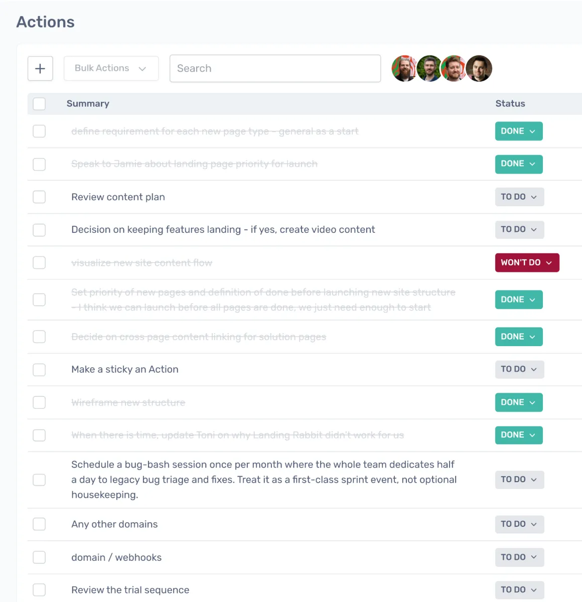 Actions from previous boards are automatically imported into the next meeting for review, staying synced to their original source so the team can discuss them in context.