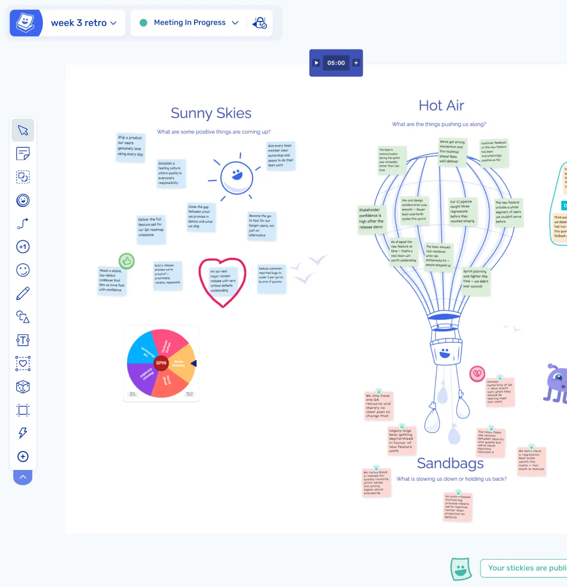 They can be run live with the team or asynchronously over time, with participants adding and organising content as needed.